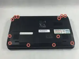 Flip the laptop over and remove all the Phillips #0 (M2-L5 mm) screws under the keyboard.