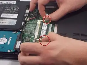 Flip the laptop over and locate the hard drive cover. This is a L shaped plastic cover and has 5 PH#1 8mm screws located around the outside edge. The screw locations are denoted by red circles in the figure.