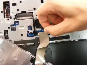 Use the spudger and slide the grey tabs on either side of the keyboard wires away from the white plastic.