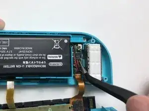 Insert a spudger or prying tool beneath the battery wires and gently pry the battery plug out of the socket on the motherboard.