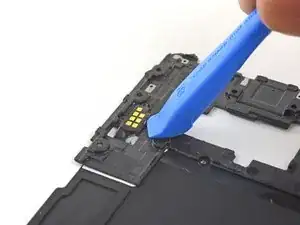 Insert the point of a spudger in the small cutout on the right edge of the plastic part of the upper midframe, near the Bixby button.
