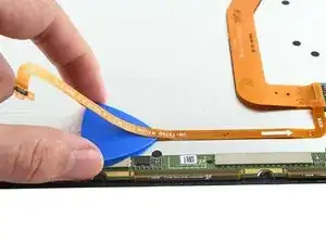 Insert an opening pick between the fingerprint cable's press connector and the circuit board near the bottom of the screen.