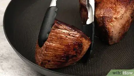 8Brown the meat in the hot oil for several minutes on each side. Rotate it carefully so that the grease doesn’t splash onto your skin.[6]