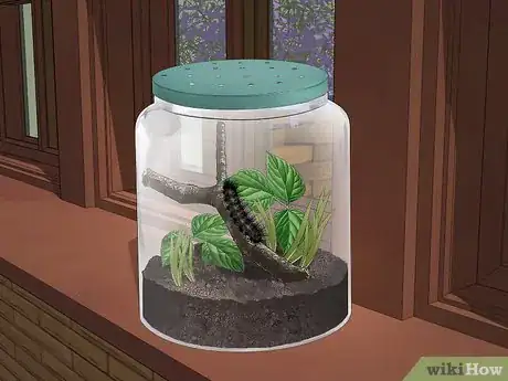 1Find a large jar or flower pot. Nearly any container can be converted into a great caterpillar home as long as you are able to secure the caterpillar and provide it air holes. Since caterpillars can crawl up the sides, it’s important to have a cover for its home. Otherwise, it’ll crawl away.[1]