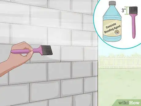 2Apply a concrete bonding agent to the cleaned wall. Dip a 3 in (7.6 cm) paintbrush into the liquid bonding agent and use it to coat the wall from top to bottom. Keep the layer as smooth as possible to ensure the veneer fits evenly on the wall.[20]