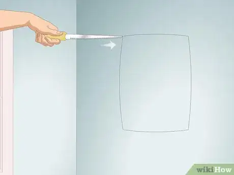 2Mark the outline of the section you want to cut out with a pencil. Identify the spot where you want to make a hole for an inspection or to access something behind the drywall. Draw the outline for the cut freehand if you just need a rough opening or use a straight edge to create perfectly straight lines.[1]