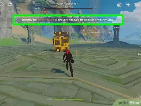2Destroy the Geo pillars. Using physical attacks or using a character that can absorb Geo (like Zhongli) attack the Geo pillars to destroy it. After destroying the Geo pillar the Hypostasis is currently on, the Hypostasis will fall to the ground then teleport to the next available Geo Hypostasis.