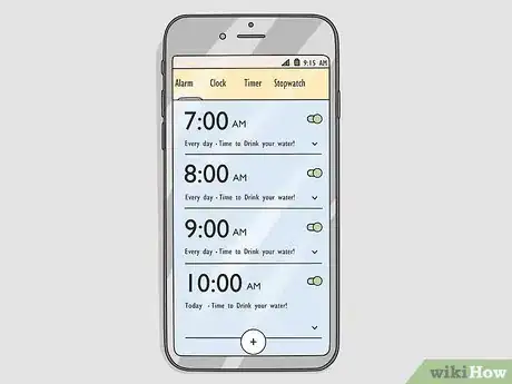 5Set an alarm on your phone to remind yourself. Try setting alarms or computer reminders that tell you to drink water once per hour, or decide on a few personal “triggers” for drinking water. Triggers to sip water can be routine activities that you do all the time, such as:[5]