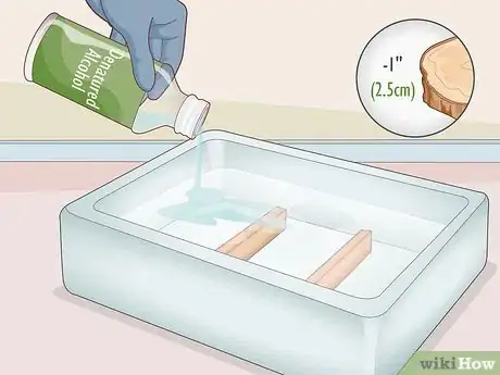 6Use denatured alcohol if the slice is less than 1 inch (2.5 cm) thick. Denatured alcohol, also known as wood alcohol, is pure ethanol with additives that make it toxic to consume. Thin wood slices soaked in denatured alcohol will dry without shrinking so quickly that cracks form. Fill your container just over halfway full with denatured alcohol so you can soak the slice without the liquid spilling over the sides.[6]