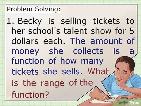1Read the problem. Let's say you're working with the following problem: "Becky is selling tickets to her school's talent show for 5 dollars each. The amount of money she collects is a function of how many tickets she sells. What is the range of the function?"