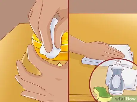 1Wipe down your kitchen surfaces and food containers with vinegar. Mix together 1 part white vinegar with 1 part water and dab it onto a paper towel or put in a spray bottle. Use this mixture to clean countertops, the inside of cupboards, and underneath appliances. You can also spray doorways, windowsills, or anywhere you have seen ants.[10]