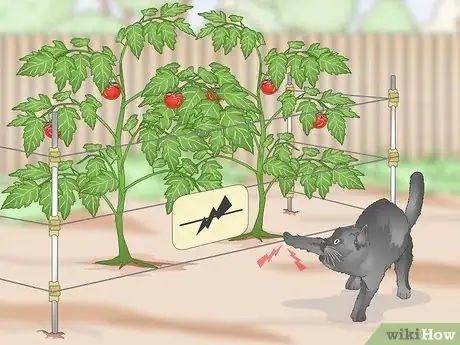 7Use a low-voltage wire.[7] An electric fence surrounding your garden can effectively keep cats out of it. As long as it is low-voltage, it will not harm the cats, only drive them away. The fence can be raised about 4 inches (10 cm) from the ground and still discourage them from entering your garden.