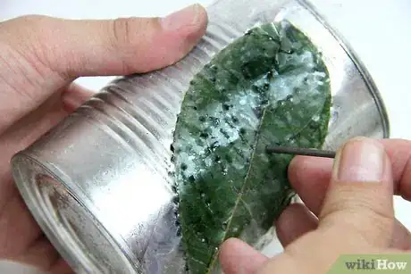 4Remove the nails and pull or tear off the leaf to expose the design. You should be able to see the same leaf pattern now outlined in nail holes on the tin can.