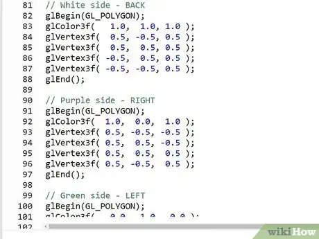 3Add glBegin() and glEnd(). OpenGL defines objects as combinations of different polygons. Using the glBegin() command, you effectively put down a pencil that will draw a shape. To lift up the pencil and begin a new shape, you must use the glEnd() command. In this tutorial you will be using GL_POLYGON to draw each side of the cube but it is possible to use other parameter options such as GL_LINE, GL_QUAD, or GL_TRIANGLE to create other shapes.