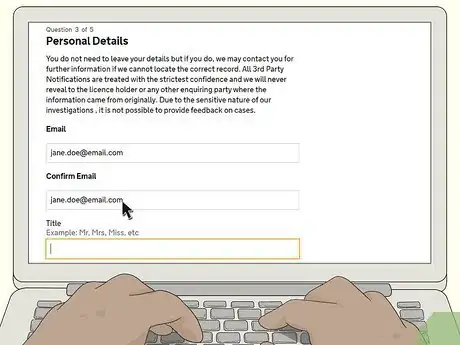 3Provide the necessary personal information to complete the form. Before submitting the form, type in your name, address, and email address. If you do not have an email address, you can leave that option blank or enter your phone number instead. When you are finished with the form, “Submit” it to the DVLA. If they need any more information, they’ll contact you either by phone or email.[6]