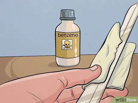 3Use lacquer thinner with benzene to wipe gunk off Japanese swords. Japanese swords sometimes require slightly different cleaning materials than steel swords. Ensure that your lacquer thinner contains benzene when cleaning these items. [2]