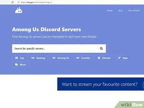 2Go to https://top.gg/servers/tag/among-us in a web browser. You can use any web browser on PC or a mobile device. This page displays a list of Discord servers for Among Us.Advertisement