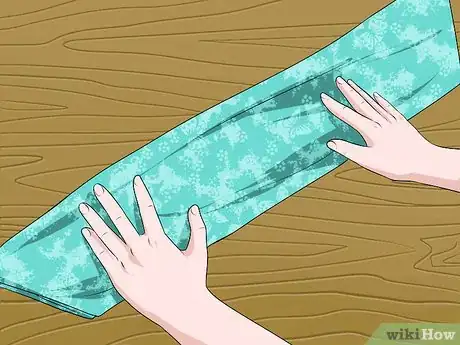 1Fold two opposite corners toward the center of the scarf.[2] The first corner should be folded a few inches past the center of the scarf. The opposite corner should be folded over the first fold that you made, so that the only corner showing is the second fold that you made.