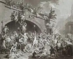 Particularly the lamp post standing at the corner of the Place de Grève and the Rue de la Vannerie served as an improvised gallows.[12] The reason for that was partly symbolic: the lantern was placed opposite the Hôtel de Ville (Paris City Hall), directly under the bust of Louis XIV, so that "popular justice could take place right under the eyes of the king".[13]