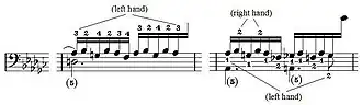In Schumann's 1836 Neue Zeitschrift für Musik article on piano études,[20] the study, together with Op. 10, No. 3, is classified under the category "melody and accompaniment in one hand simultaneously." Cortot states that the attention of the student should be directed to perfecting polyphonic playing, an expressive intensity of tone and legato and believes that finding the individual tone for each of the simultaneous melodic lines is a particular difficulty.[21] He suggests to produce the tone of the upper part by pressing the keys to the bottom with firm and straight fingers. To ensure even action of the fingers playing the figure in semiquavers he recommends to start practicing in a non legato where the fingers do not lose contact with the key. For the final legato the weight of the hand should bear slightly on each semiquaver to produce a kind of portamento with a timbre that will not merge into the upper melodic line.[21] Cortot also introduces an exercise for flexibility of the foot to produce an "uninterrupted quivering" pedal, but advises to practice the finger legato first without pedal.[22] There are no original pedal marks by Chopin.