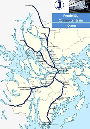 Ösmo station is a railway station on the Nynäs Line of Stockholm's commuter rail network, located in the urban area of Ösmo in the municipality of Nynäshamn in Stockholm County. As of 2019, on a normal winter weekday, the station has approximately 1,300 boarding passengers.[1] The station is located on the single-track Hemfosa-Nynäshamn section of the line, and lacks ticket barriers. The journey time from Ösmo to Stockholm City Station is approximately 45 minutes.[2]
