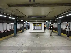 The station is unusual in design for an IRT station, being a bi-level station with island platforms.[25] The 4 and 6 trains stop here at all times;[26][27] the 5 train stops here at all times except late nights;[28] and the <6> train stops here during weekdays in the peak direction.[27] The 5 train always makes express stops,[28] and the 6 and <6> trains always make local stops;[27] the 4 train makes express stops during the day and local stops at night.[26]