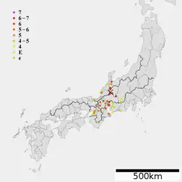 The earthquake had a maximum JMA intensity of Shindo 6–7 extending from the Noto Peninsula to Lake Biwa.[5][31] Extreme damage was reported between Nara, Osaka, Toyama and Shizouka. Large conflagrations broke out as a result. Large-scale landslides occurred in the northern part of the damage zone which was dominated by mountains. A fortress was completely wiped out by one of these landslides, while another collapsed during the tremors.[31] A triggered landslide on Kaerikumoyama buried the Kaerikumo Castle and 300 houses,[32] killing 500 people.[33] The Ōgaki Castle was destroyed by a fire.[34] The only daughter of Yamauchi Kazutoyo was killed in Nagahama.[35]