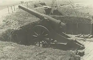 During the mobilization for World War II the 15 cm Lang staal L/24 was brought out of storage. Three new artillery regiments of only one company (Artillerie Afdeling) were founded. These were the units: 24 AA, 25 AA and 26 AA. Each had three batteries of 4 15 cm Lang staal L/24, but no traction.[26] 25 AA was actively engaged in the fight near Moerdijk. Four of its 12 guns permanently broke down due to mechanical defects. For multiple reasons, the fire of the guns was almost completely ineffective. 26 AA was in Numansdorp. When the enemy did not appear before its guns, it had to move. After the orders were given, and horses were collected etc. two days had passed, and the army had surrendered.[27]