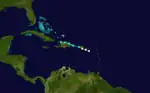 Early on September 5, a hurricane was first observed about 65 mi (105 km) southeast of Christiansted in the Danish Virgin Islands.[1] One meteorologist assessed the hurricane as being located near Antigua on September 3.[2] Tracking steadily west-northwestward, it quickly moved ashore near Ponce, Puerto Rico with winds estimated at 80 mph (130 km/h). After crossing southwestern Puerto Rico, the hurricane emerged into the Mona Passage as a tropical storm. Late on September 5 it made landfall on eastern Dominican Republic; it quickly weakened over Hispaniola, dissipating on September 6 over the northwestern portion of the island.[1] An assessment by scholar Michael Chenoweth in 2006 indicated this storm was the same as the next hurricane, with it continuing northwestward and ultimately reaching the Gulf of Mexico.[2] Due to not being considered the same cyclone in the official hurricane database,[1] this hurricane and the following hurricane are listed separately.[4] There, the passage of the storm caused severe flooding, which destroyed large quantities of crops and damaged several roads. Storm damage was heaviest between Guayanilla and Mayagüez.[10] More than 100 people were killed in Puerto Rico,[11] many of whom died due to flooding.[10]