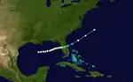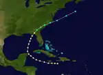 A moderately strong hurricane with winds of 105 mph (169 km/h) was first spotted on October 6 east of Jamaica. Passing a short distance south of the island, the hurricane tracked northwestward and brushed the Yucatán Peninsula before turning north-northeastward into the Gulf of Mexico.[1] Late on October 9, it made landfall a short distance east of Apalachicola, Florida at peak winds with an estimated pressure of 969 mbar.[14] Rapidly weakening to tropical storm status, the cyclone continued northeastward and emerged into the Atlantic Ocean from North Carolina on October 11. Later that day, it was last observed about 250 mi (400 km) southeast of Cape Cod.[1]