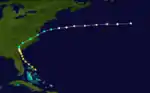 The Coastal Hurricane of 1854 or The South Carolina Hurricane of 1854 closely duplicated the path of the famous 1804 Antigua–Charleston hurricane. The brig Reindeer sighted a hurricane about 25 miles (40 km) east of Hope Town in The Bahamas on September 7.[1] With winds of 125 mph (201 km/h) and a minimum barometric pressure of 938 mbar (27.7 inHg), this was the strongest tropical cyclone of the season. It moved northwestward and weakened slightly on September 8. Later that day at 2000 UTC, the hurricane made landfall near St. Catherines Island, Georgia with winds of 115 mph (185 km/h). Early on September 9, it weakened to a Category 1 hurricane, then a tropical storm several hours later. Thereafter, the storm accelerated northeastward and re-emerged into the Atlantic Ocean near Virginia Beach, Virginia on September 10. The system re-strengthened, becoming a hurricane again on September 11. It eventually began to weaken again while moving rapidly eastward and was last noted about 515 miles (829 km) southeast of Cape Race, Newfoundland.[2]