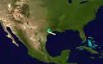 A tropical storm was first observed in the Gulf of Mexico on June 25, while located about 240 miles (390 km) south-southwest of Marsh Island, Louisiana. It headed westward and strengthened into a hurricane about 12 hours later. Peaking with maximum sustained winds 80 mph (130 km/h) and a minimum barometric pressure of 982 mbar (29.0 inHg),[2][3] the storm maintained this intensity until making landfall in South Padre Island, Texas at 1200 UTC on June 26. It quickly weakened inland and fell to tropical storm strength about six hours later. The system continued in a west-northwestward direction over northern Mexico, until dissipating in a rural area of Coahuila on June 27.[2]