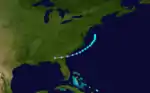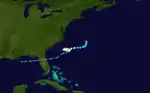 In late September, a cold front moved into the Gulf of Mexico. By October 3, a low pressure associated with the front developed.[4] Initially extratropical, the low moved east-northeastward and crossed Florida on October 4. After entering the Atlantic early on October 5, the low began strengthening and soon reached the equivalency in intensity to a tropical storm. Around 00:00 UTC on October 6, the system transitioned into a tropical cyclone while situated about 260 mi (420 km) southeast of Cape Fear in North Carolina. Already a strong tropical storm, the cyclone intensified into a hurricane about six hours later. [5] Late on October 6, a vessel observed a barometric pressure of 996 mbar (29.4 inHg), the lowest in relation to the stop. Based on this, it is estimated that the hurricane peaked with maximum sustained winds of 90 mph (150 km/h).[4] The storm then began to execute a small cyclonic loop, which continued until early on October 8. By then, the cyclone was moving eastward and weakened to a tropical storm around 00:00 UTC on October 9. About 24 hours later, the system weakened to a tropical depression. At 18:00 UTC on October 10, the depression dissipated about 280 mi (450 km) northeast of Bermuda.[5]