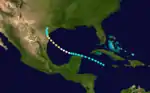Observations from ships first indicated the presence of a tropical storm to the southeast of the Cayman Islands on October 11.[4] Moving west-northwestward, the storm strengthened steadily, reaching winds of 70 mph (110 km/h) before making landfall near Cancún, Quintana Roo, early on October 13. The system weakened slightly over land and while situated in the Gulf of Mexico just north of the Yucatán Peninsula, but began re-intensifying later that day. By 12:00 UTC on October 14, the cyclone deepened into a Category 1 hurricane and then a Category 2 hurricane about 24 hours later. The hurricane made landfall on central Padre Island between Corpus Christi and Port Mansfield in Texas late on October 16 with winds of 100 mph (155 km/h),[5] estimated based on a storm surge of 6 ft (1.8 m). A barometric pressure of 970 mbar (29 inHg) was estimated using the pressure-wind relationship.[4] The system quickly weakened to a tropical storm early on October 17, several hours before weakening to a tropical depression. The storm dissipated early on October 18.[5]
