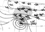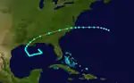 On June 7, ships in the Gulf of Mexico reported a low pressure area with a closed circulation about 100 mi (160 km) southeast of Port Eads, Louisiana.[4] Initially, the storm moved slowly southeastward, before turning west-southwestward late on June 8. Strengthening slightly, the cyclone turned to the northwest by June 11.[5] Around 12:00 UTC on the following day, a ship observed a barometric pressure of 995 mbar (29.4 inHg), the lowest known in relation to the storm. Based on this, maximum sustained winds were estimated at 70 mph (110 km/h).[4] Early on June 13, the storm curved northeastward and made landfall near Franklin, Louisiana, around 05:00 UTC. The system slowly weakened and emerged into the Atlantic Ocean from the Outer Banks of North Carolina, while still at tropical storm intensity. By 12:00 UTC on June 16, the cyclone weakened to a tropical depression. About 24 hours later, the depression dissipated about 150 mi (240 km) north of Bermuda.[5]