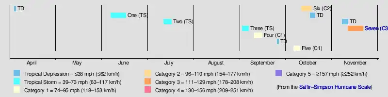 The season's activity was reflected with an accumulated cyclone energy (ACE) rating of 57,[2] near the 19111920 average of 58.7.[3] ACE is a metric used to express the energy used by a tropical cyclone during its lifetime. Therefore, a storm with a longer duration will have high values of ACE. It is only calculated at six-hour increments in which specific tropical and subtropical systems are either at or above sustained wind speeds of 39 mph (63 km/h), which is the threshold for tropical storm intensity. Thus, tropical depressions are not included here.[2]