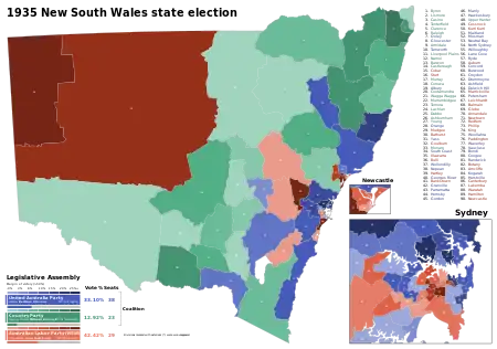 The 1935 New South Wales state election was held on 11 May 1935. This election was for all of the 90 seats in the 31st New South Wales Legislative Assembly and was conducted in single member constituencies with compulsory preferential voting.[1][2][3]