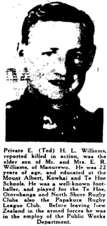 195. "Private Edward (Ted) Henry Leonard Williams". Auckland Star, Volume LXXIII, Issue 165. 1942-07-15. p. 6. Retrieved 2022-04-19.