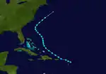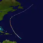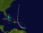 A tropical storm was documented passing through the Windward Islands into the Caribbean Sea early on October 11.[8] It intensified into a hurricane by 12:00 UTC the next morning, whereupon it began a curve toward the north. The cyclone passed through the Mona Passage and attained its peak a Category 2 hurricane with winds of 110 mph (175 km/h) shortly thereafter. Passing within 180 mi (290 km) of Bermuda, it produced winds around tropical storm-force there before it was last documented over the northwestern Atlantic early on October 17.[7][8]