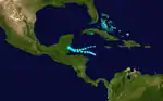 The final tropical cyclone of the season formed about 160 mi (260 km) northeast of the Honduras–Nicaragua border around 12:00 UTC on October 20. The fledgling cyclone intensified into a tropical storm twelve hours later and then attained winds of 45 mph (75 km/h) a while thereafter, marking its peak intensity. The system moved west for several days and passed through the Belize Barrier Reef before executing a sharp eastward turn early on October 24, causing only delayed shipping and aviation schedules,[14] as well as peak winds of 35 mph (56 km/h) in the Swan Islands.[10] From there, it maintained its status as a weak storm before transitioning into a post-tropical cyclone about 130 mi (215 km) southwest of the Cayman Islands by 06:00 UTC on October 26.[8]