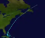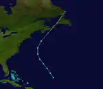 The northern end of a trough developed into a tropical depression just north of the Berry Islands in the Bahamas around 00:00 UTC on September 13. It attained tropical storm intensity six hours later and attained peak winds of 50 mph (85 km/h) by 18:00 UTC as it moved north-northeast. The cyclone lost tropical characteristics by 12:00 UTC on September 15 while positioned about 95 mi (155 km) south-southeast of Nantucket and subsequently tracked across Nova Scotia and Newfoundland. It was last observed over the northern Atlantic on September 17.[8] Impacts from the storm were relegated to heavy rainfall along the shores of Nantucket, "extraordinarily high tides" northeast from Cape Cod, as well as gale-force winds and 1.2 in (30 mm) of rainfall from the post-tropical cyclone within Nova Scotia.[10][11]