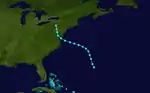 A tropical wave ascended to tropical storm status by 06:00 UTC on September 28 while located about 230 mi (370 km) south of Bermuda.[7] It moved northwest and then west-northwest, steadily organizing to attain peak winds of 65 mph (100 km/h) early on September 30. The storm then moved ashore the central coast of Maryland and was last distinguishable near Williamsport, Pennsylvania, around 00:00 UTC on October 2.[8] Considerable damage to crops, and lesser damage to structures, was inflicted throughout the Norfolk and Cape Charles, Virginia, areas, with damage estimated at $20,000.[10] Rainfall was generally light, peaking at 4.6 in (117 mm) in Diamond Springs,[9] but did result in some street flooding. A small ship and several small boats were sunk. Atlantic City, New Jersey, reported a maximum gust of 70 mph (113 km/h), and only slightly weaker gusts were recorded throughout Virginia. One death was reported.[10]