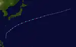 A disturbance was first noted in the vicinity of Micronesia on June 17 approximately 400 km (250 mi) south of Guam. Aircraft traversing between Guam and the Philippines eventually confirmed the presence of a developing tropical depression by June 25, tracking towards the west.[7] By the following day, the system had strengthened into a tropical storm. The system curved towards the north by June 28 and had begun to trend towards the northeast thereafter, gradually strengthening to a typhoon by 18:00 UTC that day. The storm continued to accelerate towards the northeast, passing just east of the Ryukyu Islands on June 30 before reaching peak intensity offshore Kyushu with maximum sustained winds of 185 km/h (115 mph) and a central pressure estimated at 975 mbar (975 hPa; 28.8 inHg). Kate weakened slightly before making landfall the following day on Shikoku with winds of 170 km/h (110 mph).[16] The typhoon curved eastward and continued to weaken, tracking through Sagami Bay and emerging over the Pacific Ocean on July 2 as a tropical storm.[7][16] Kate transitioned into an extratropical cyclone and would later dissipate the following day.[17]