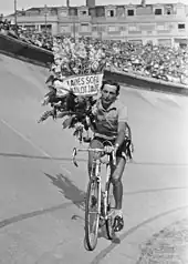 The 1952 Tour de France saw the introduction of the combativity award, a daily award for the most combative rider of the stage.[19] The winner of that award received 100,000 French francs.[5] The super-combativity award, the award for the most combative rider of the entire Tour de France, was also first given in 1953, determined by a jury vote,[20] to Robic.[21] The Souvenir Henri Desgrange was given to the first rider to pass the memorial to Tour founder Henri Desgrange near the summit of the Col du Galibier stage 11. This prize was won by Fausto Coppi.[22][23] The special award for the best regional rider was won by eighteenth-placed Marcel Zelasco.[5]