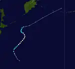 A tropical disturbance developed on January 8 to the southwest of Palau.[1] By the next day, the disturbance was upgraded to a tropical depression and to a tropical storm. Wanda reached its peak intensity on January 10 as a 65 mph tropical storm. The storm was then downgraded to a tropical depression on January 11. Wanda then dissipated on January 14.[3]
