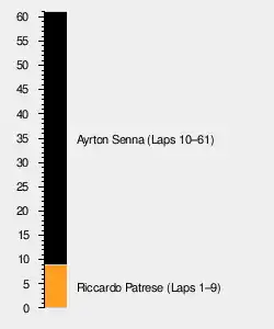 Moreno's gearbox broke on lap 52 causing him to retire, whilst Senna was having problems with oil pressure caused by the special high-torque Honda V12. As the Leyton House of Maurício Gugelmin eventually retired with an engine failure on lap 58. Berger put in a series of fastest laps to cut Senna's lead to just 1.7s at the line. Eric van de Poele had retired on the last lap as the result of fuel pump problems.