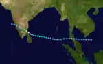 On November 27, the JTWC first mentioned an area of convection south of Vietnam as an area of possible tropical cyclone development. A ridge to the north steered the convective system westward across the Malay Peninsula. The system entered the eastern Bay of Bengal on November 29, and convection increased further in conjunction with a weak circulation. The JTWC classified the system as Tropical Cyclone 02B on November 30, and the IMD designated it as a depression a day later. The storm gradually intensified while moving west-northwestward toward southeastern India, developing an eye in the center of the convection. On December 4 between 04:00–05:00 UTC, the cyclone made landfall near the city of Karaikal, which recorded gusts of 198 km/h (123 mph) during the storm's passage. The IMD estimated peak winds of 165 km/h (105 mph), higher than the JTWC wind estimate of 140 km/h (85 mph). The storm rapidly weakened over land to depression intensity, and the IMD stopped tracking the system late on December 4. The JTWC tracked the system into the Arabian Sea on December 5, where the circulation dissipated shortly thereafter.[3][2]