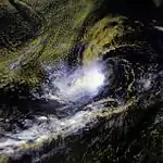 On July 1, a tropical wave organized into Tropical Depression Five-E.[10] The location of the depression was the easternmost since the depression that eventually became Hurricane Paul in the 1982 season.[19] Five-E strengthened into Tropical Storm Cristina on July 2 as it continued its west-northwest track. Cristina was almost a hurricane at the time of its landfall near Puerto Ángel on July 3. It peak strength, which occurred at landfall, was 70 mph (110 km/h) and 991 mbar (29.3 inHg). Cristina dissipated over the mountains of Mexico on July 3.[10]