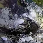 On July 4, a persistent area of thunderstorms organized into a tropical depression. Weak steering currents slowly moved it northwest.[20] Easterly wind shear inhibited the development of the system.[21] Despite the wind shear, Six-E was forecast to strengthen into a tropical storm,[22] but it instead weakened to a swirl of clouds and advisories were ended on July 5.[23] Tropical Depression Six-E dissipated on July 6. At its peak strength, Six-E had winds of 35 mph (56 km/h) and a central pressure of 1,003 mbar (29.6 inHg).[24]