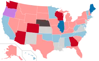 ![]() Map of upper house elections: Democrats gained control Democrats retained control Republicans gained control Republicans retained control Split body formed Non-partisan legislature No regularly-scheduled elections | |||||||||||||||||||||